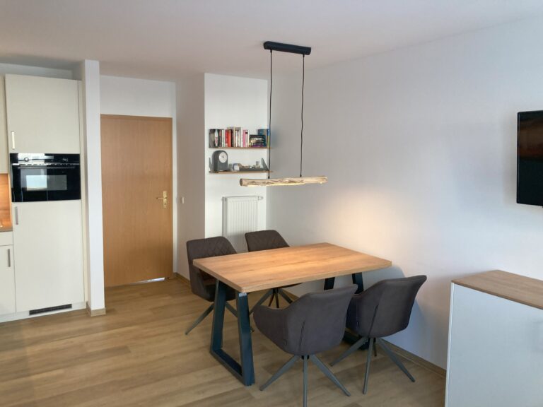 Das sehr schöne 2-Zimmer-Appartment für bis zu 4 Personen bietet auf 47 qm ein helles Wohn- Esszimmer mit offener Küchenzeile (inkl. Induktionskochfeld, Geschirrspühler, Kühlschrank mit Gefrierfach und Mikrowelle mit Backfunktion) mit einem großen möblierten Süd-West-Balkon.